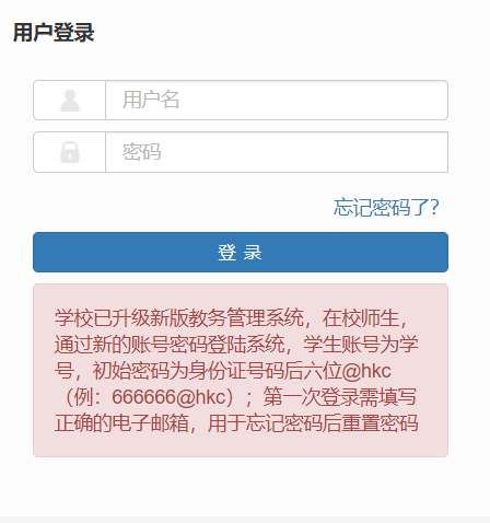 學校已升級新版教務(wù)管理系統(tǒng),在校師生,通過新的賬號密碼登陸系統(tǒng),學生賬號為學號,初始密碼為身份證號碼后六位@hkc(例:666666@hkc);第一次登錄需填寫正確的電子郵箱,用于忘記密碼后重置密碼