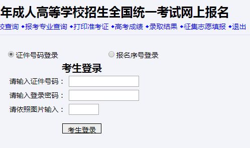 ◆首頁(yè) ◆考生登錄 ◆報(bào)考院校查詢 ◆報(bào)考專業(yè)查詢 ◆打印準(zhǔn)考證 ◆高考成績(jī) ◆錄取結(jié)果 ◆征集志愿填報(bào) ◆退出山東成人高考