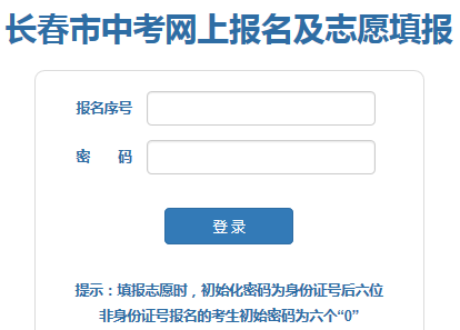 提示:填報(bào)志愿時(shí),初始化密碼為身份證號(hào)后六位 非身份證號(hào)報(bào)名的考生初始密碼為六個(gè)“0” 長(zhǎng)春市中考網(wǎng)上報(bào)名及志愿填報(bào)
