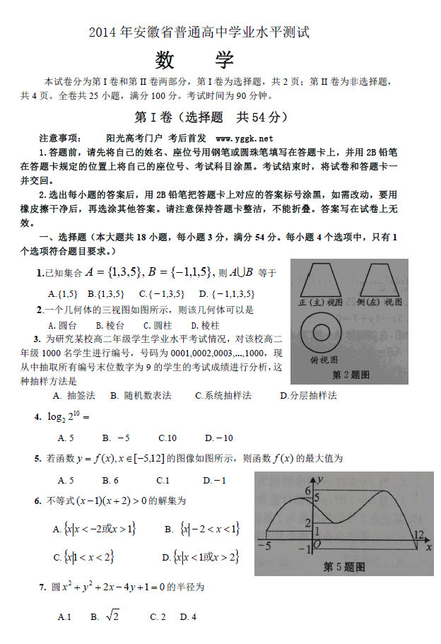 2015年安徽省普通高中學(xué)業(yè)水平考試數(shù)學(xué)試題及答案