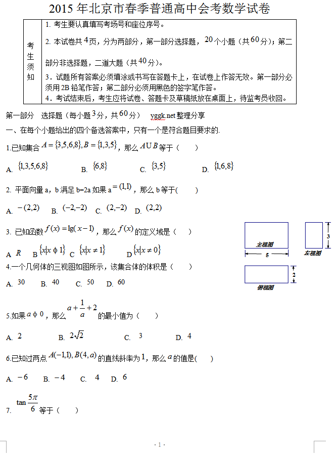 北京市2015年春季普通高中會(huì)考數(shù)學(xué)試卷及答案