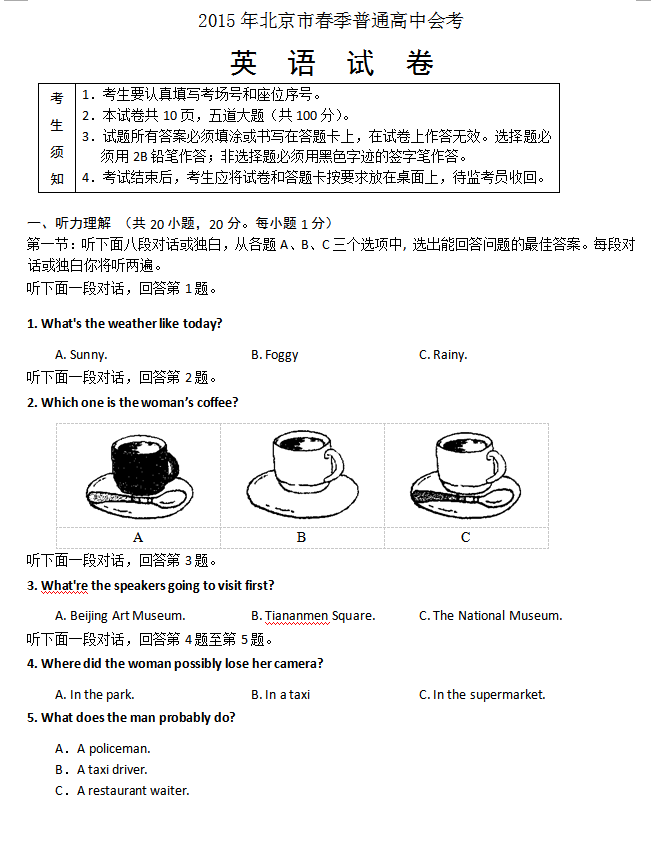北京普通高中2015年春季會(huì)考英語(yǔ)試題及答案