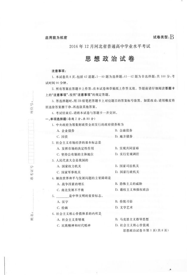 河北省2016年12月普通高中學(xué)業(yè)水平考試政治試題