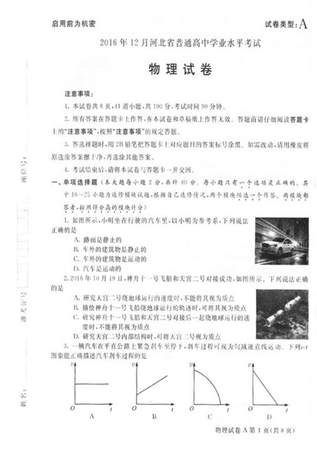 河北省普通高中2016年12月學(xué)業(yè)水平考試物理試題