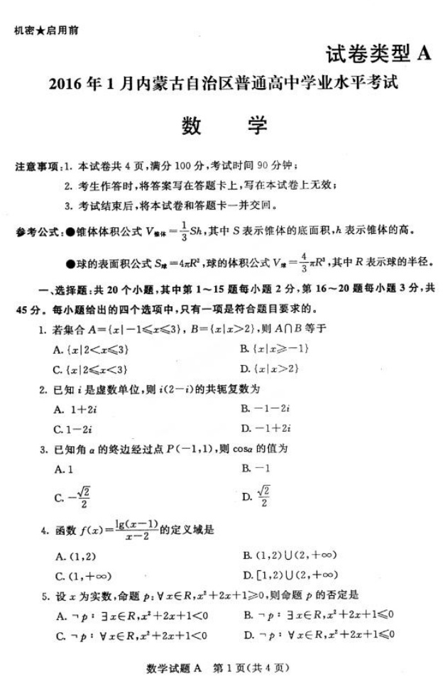 內(nèi)蒙古2016年1月普通高中學(xué)業(yè)水平考試數(shù)學(xué)試題及答案