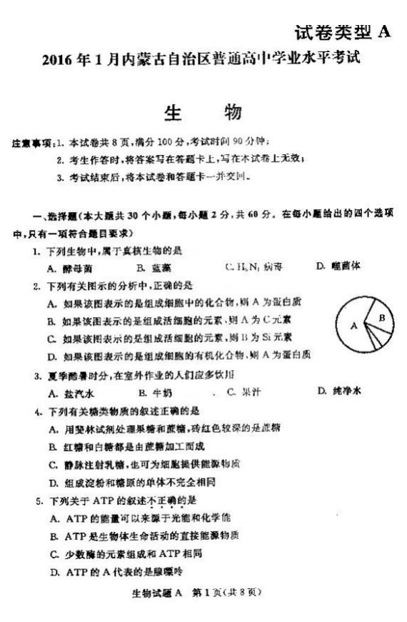 內(nèi)蒙古自治區(qū)2016年1月普通高中學(xué)業(yè)水平考試生物試題及答案