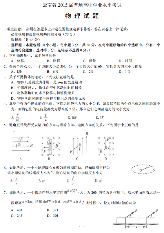 云南省2015年1月普通高中學(xué)業(yè)水平考試物理試題及答案