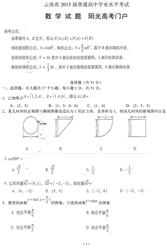 云南省2015年1月普通高中學業(yè)水平考試數(shù)學試題及答案