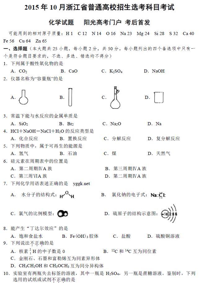 浙江省2015年10月高中學(xué)業(yè)水平考試化學(xué)試題及答案